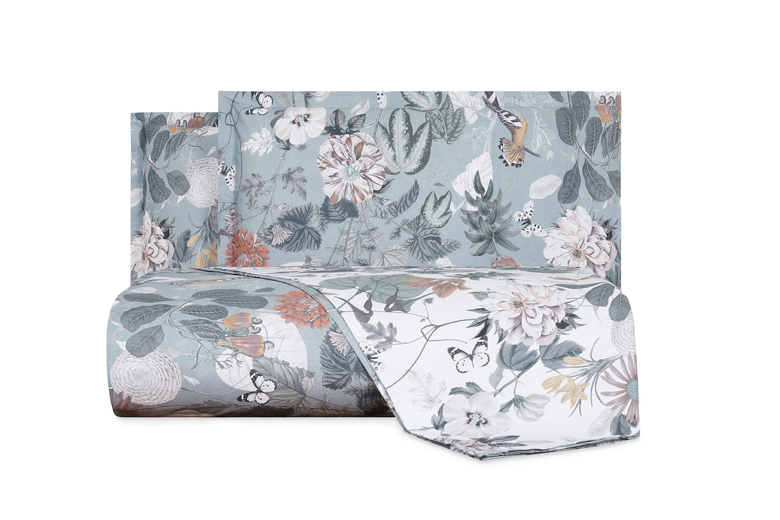 L’azzurro polvere concorre a conferire una connotazione invernale a questo disegno ricchissimo, declinato su morbido percalle e caratterizzato da una grande varietà di fiori, foliage, farfalle e piccoli volatili. Con una balzatura più fitta ai piedi del letto e più rada alla testa, respira con il solo fondo nella parte centrale ed è arricchito da una texture che richiama la lavorazione di una trama tessile.