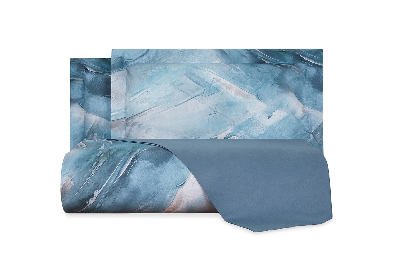 Colori freddi e invernali per un disegno che ripropone per la stanza del riposo il movimento armonioso e fluido di un soffio di vento. Proposto in versione completo letto, trapunta e completo copripiumino in puro percalle 100% cotone, il design fa parte della collezione Bed Art, la linea letto a marchio Carrara pensata per ambienti contemporanei e fuori dagli schemi.
