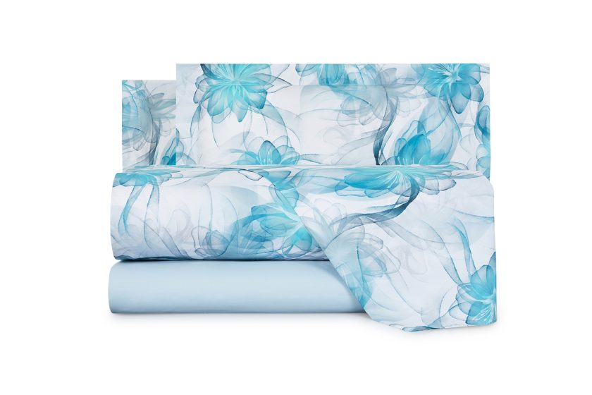 Un’interpretazione leggera e astratta di un motivo floreale di pura fantasia, che si dispiega sul piano del letto arricchendolo con un tocco leggero attraverso l’andamento sinuoso, morbido, e marino delle foglie. Il disegno, su percalle, fa parte di una ricerca più contemporanea e astratta del motivo floreale e viene proposto nella variante giallo paglierino e in turchese.