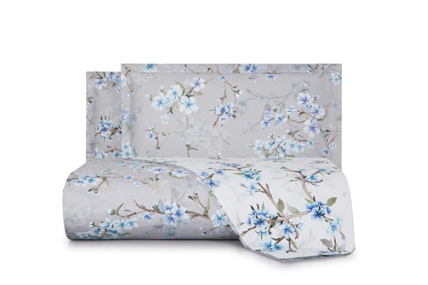 Declinato su percalle, il disegno rappresenta un ramo di pesco fiorito, disposto in all-over sul letto, e gioca su due piani: il primo definito, inciso, mentre il secondo leggero, impalpabile, che sfuma in trasparenza sul fondo. La fantasia è proposta in due varianti colore: grigio/turchese e lilla/rosa.